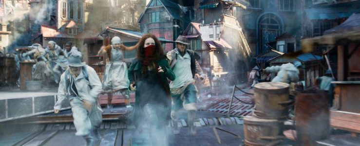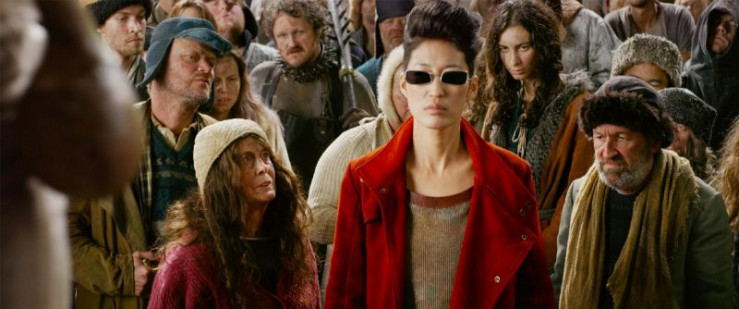 Hester Shaw (Hera Hilmar, M.) und Bürger einer kleinen Traktionsstadt auf der Flucht.