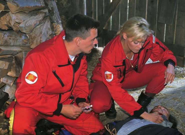 Zur gleichen Zeit will der Landwirt Anton Wildweg seinem Nachbarn Franz Holler eine leer stehende Scheune abkaufen. Trotz hoher Schulden lässt sich Holler jedoch nicht auf den Handel ein. In der Zwischenzeit hat es sich ein Landstreicher unbemerkt in dem Holzschuppen bequem gemacht. Zufällig beobachtet er, wie Holler die Scheune in Brand steckt, um die Versicherungssumme zu kassieren. Plötzlich sieht Franz den Obdachlosen, der bereits vom Feuer erfasst wird. Trotzdem verriegelt er die Tür von außen. Doch Franz' Frau bemerkt die Tat und rettet den brennenden Mann in letzter Sekunde aus den Flammen und erstickt den Brandherd. Währenddessen erreichen Dr. Kollmann und ihre Crew den Unfallort. Die Notärztin kümmert sich sofort um die schlimmen Brandwunden des Landstreichers. Als der Landstreicher schließlich wieder bei Bewusstsein ist, macht er Franz für die Tat verantwortlich. Der beschuldigte Bauer rastet aus und bringt Gabriele Kollmann, Ralf Staller und den Verletzten in seine Gewalt. Brutal zwingt er seine Geiseln zurück in die halbabgebrannte Scheune und zündet den Schober erneut an. In der Zwischenzeit kommt Peter Bergers schwangere Freundin Barbara auf den Stützpunkt, um Peter abzuholen. Plötzlich verspürt sie einen Stich im Unterleib und hat starke Blutungen. Barbara muss sofort ins Krankenhaus gebracht werden. Doch alle Bemühungen kommen zu spät. Im Krankenhaus verliert Barbara ihr Kind...