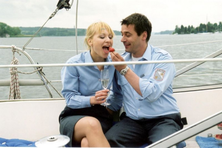 Um das Falschgeld im Spind hinter ihr zu verdecken, lenkt Annika (Sylwia von Wildburg) Hendrik (Ulrich Drewes) mit ihren weiblichen Reizen ab... +++ Die Verwendung des sendungsbezogenen Materials ist nur mit dem Hinweis und Verlinkung auf RTL+ gestattet. +++