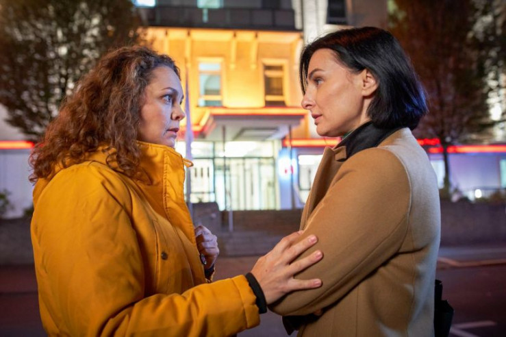 Ella (Ines Quermann, l.) tröstet Nora Altmeyer (Mimi Fiedler, r.) nach ihrer Suspendierung auf dem Pakplatz der Klink.