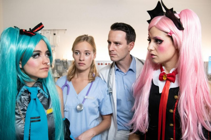 Gamerin Hibishu (Silvana Damm, l.) und Krankenschwester Kiki (Valerie Huber, 2.v.l.) beobachten wie Dr. Jan Kühnert (Marc Dumitru, r.) die Kopfverletzung von Okashi (Adriana Möbius 2.v.r.) näht.