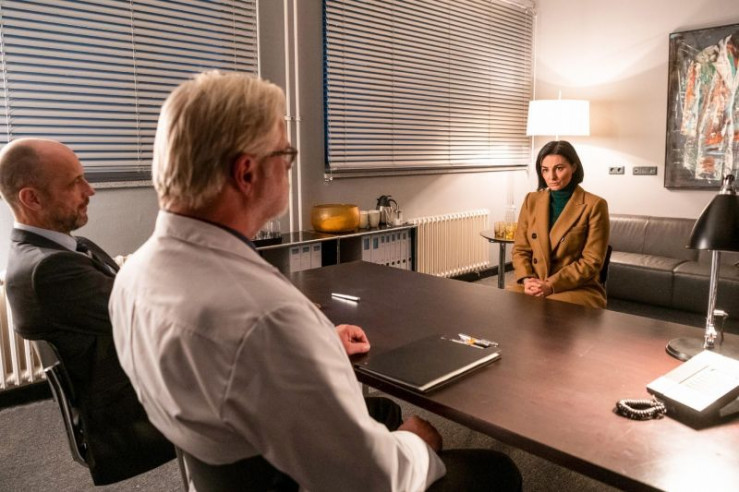 Klinikchef Carsten Bachmann (Christian Koerner, l.) und Chefarzt Prof. Dr. Kühnert (Sebastian Kowski, 2.v.l.) sprechen mit Schwester Nora (Mimi Fiedler, r.) über ihre Suspendierung.