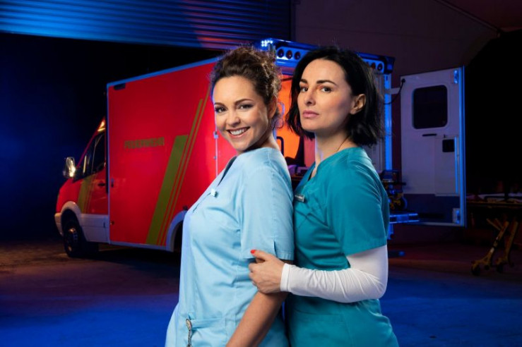 Meike (Sarah Hannemann, M.) und Dr. Leonie Mertens (Linda Marlen Runge, r.) witzeln über ihre Kollegin Kiki (Valerie Huber, l.), nachdem Okashi und ihre Freundin das Krankenhaus verlassen haben.