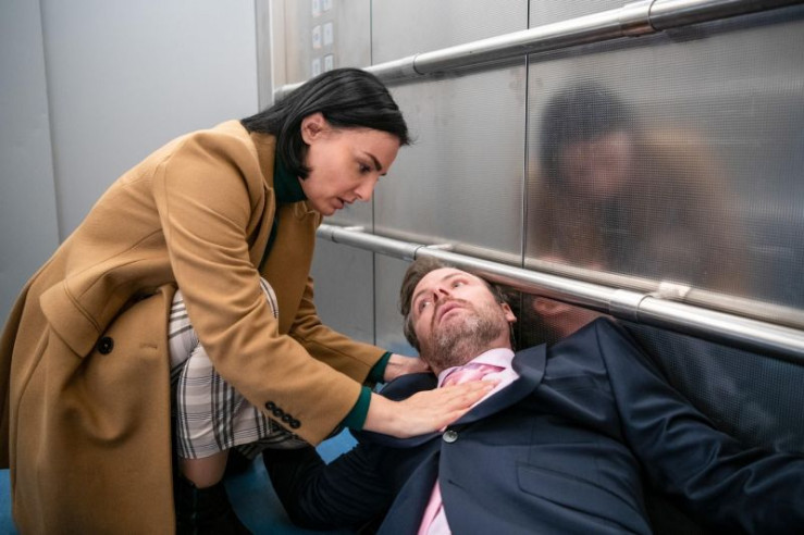 Der Klinik-Anwalt Marco Heise (Nicolas Reinke, r.) bricht im Aufzug zusammen. Nur die suspendierte Krankenschwester Nora (Mimi Fiedler, l.) ist da um ihm zu helfen.