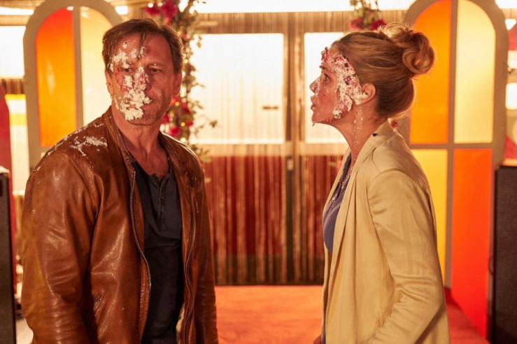 Tortenschlacht! Karin (Jessica Ginkel) klatscht Stefan (Hendrik Duryn) eine Torte ins Gesicht. +++ Die Verwendung des sendungsbezogenen Materials ist nur mit dem Hinweis und Verlinkung auf RTL+ gestattet. +++