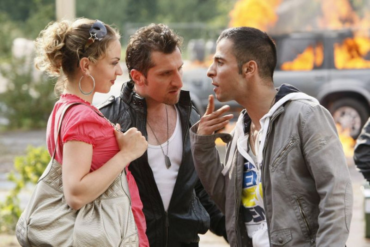 Cem (Eralp Hüseyin Uzun, re.) erkennt in Corinna (Mariangela Scelsi) die Kundin, die ihn den Job gekostet hat und er will abhauen. Wird Tayfun (Tim Seyfi) das zulassen?