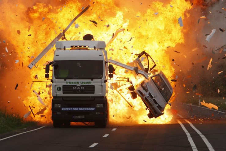 Der Wagen der Autobahnkommissare und ein daneben fahrender Tank-LKW wird von Kugeln getroffen. Der Tanker explodiert und katapultiert den Dienstwagen in die Luft...