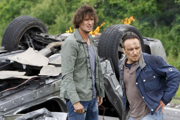 Ben (Tom Beck, l.) und Semir (Erdogan Atalay) fragen sich, wo die Kugeln herkamen, die ihr Auto getroffen haben. Der Tank-LKW neben ihnen ist in Flammen aufgegangen und hat ihren Dienstwagen in die Luft katapultiert.