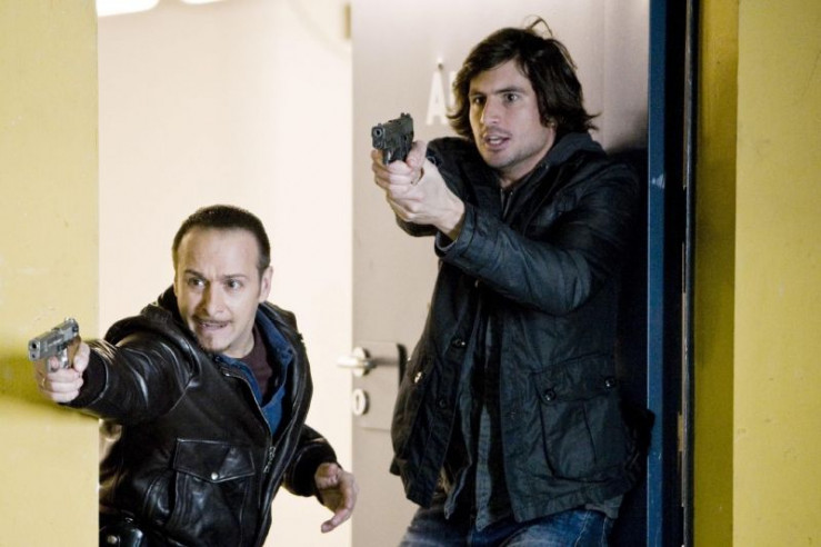 Ben (Tom Beck, l.) und Semir (Erdogan Atalay) verfolgen die Gangster und es kommt zum Schußwechsel. +++ Die Verwendung des sendungsbezogenen Materials ist nur mit dem Hinweis und Verlinkung auf RTL+ gestattet. +++