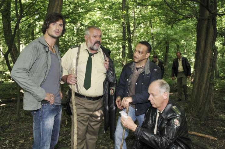 (v.li.) Ben (Tom Beck), Herzberger (Dietmar Huhn), Semir (Erdogan Atalay) und Bonrath (Gottfried Vollmer) werden im Wald fündig: Blutspuren und ein Namensschild geben Hinweise.