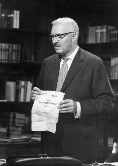 Kriegsgerichtsrat Schramm verurteilt den Gefreiten Rudi Kleinschmidt wegen Schokoladendiebstahls kurz vor Kriegsende zum Tode. Nur ein Fliegerangriff verhindert die Erschießung. Vierzehn Jahre später zieht Rudi als Straßenverkäufer durchs Land und trifft unvermutet auf seinen einstigen Richter, der als Oberstaatsanwalt Karriere gemacht hat. Schramm, insgeheim noch immer ein Nazi, fürchtet Rudis Rache und setzt alles daran, den Mann aus der Stadt zu weisen. Doch damit bringt er den arglosen Rudi erst recht auf eine verhängnisvolle Idee.
