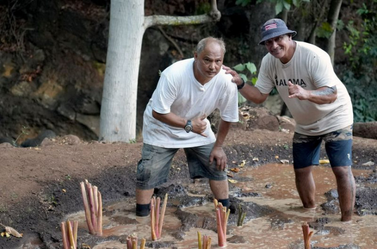 Gemeinsam mit Sohn Tai (li.) bereitet Koch Kyle Kawakami (re.) direkt am Strand von Maui ein traditionelles Mahl mit frischem, selbst gefangenem Fisch und regionalen Zutaten zu.
