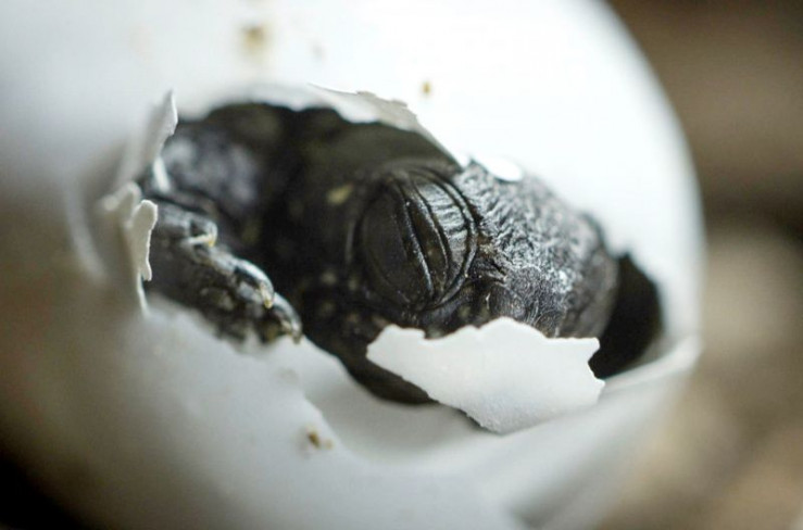 Eine europäische Sumpfschildkröte schlüpft aus dem Ei.