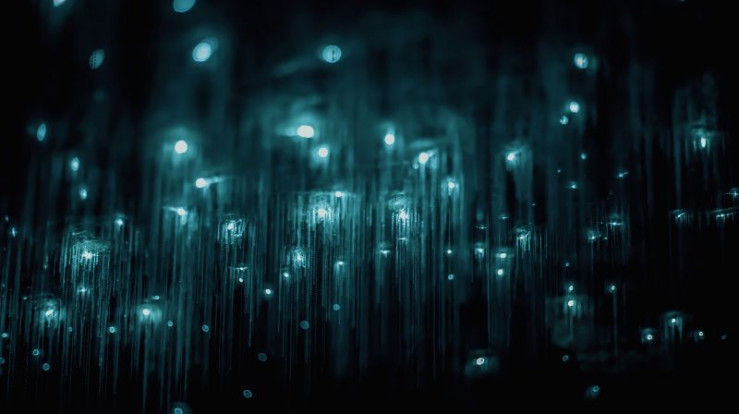 Leuchtende Mücken in den Waitomo Caves. Mit ihrem Licht locken sie andere Insekten an, die sich in ihren Fäden verfangen.