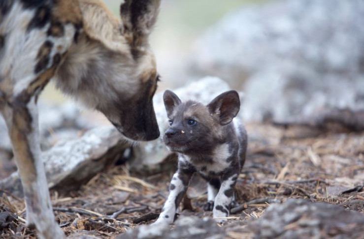 Mutter Wildhund und einer ihrer Welpen beschnuppern einander.