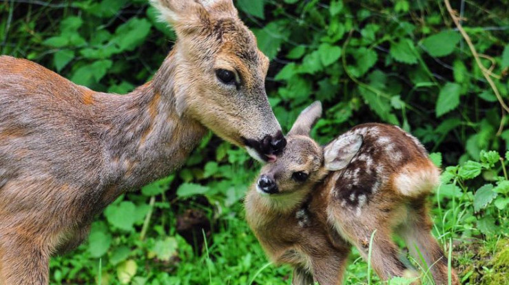 Rehmutter und Kitz - oft lässt die Geiß das Kitz allein zurück, um von Feinden abzulenken.