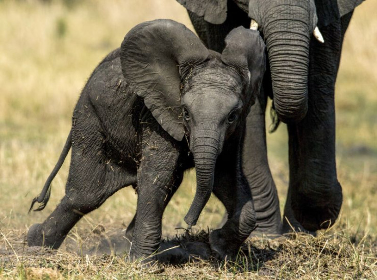 Ein kleiner Elefant tollt zwischen den Beinen seiner Mutter umher.