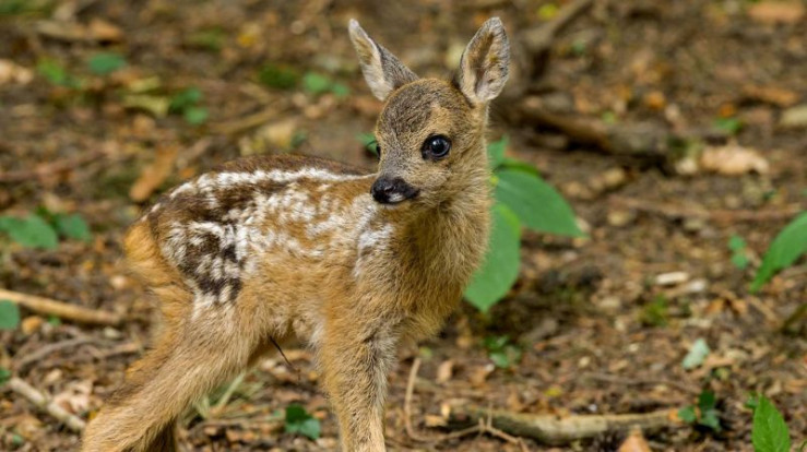 Rehkitz - die Flecken auf seinem Rücken sehen wie Sonnenflecken am Waldboden aus.