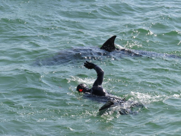 Delfindame Dusty besucht die Schwimmer in County Clare.