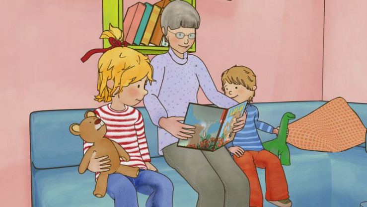 Conni freut sich über das Buchgeschenk ihrer Oma.