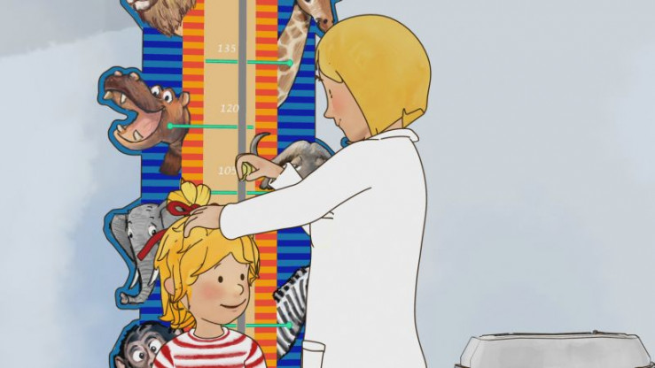 Wie geht denn so was? Conni wird gemessen, gewogen und soll zeigen, wie beweglich sie ist. Alles kein Problem. Der Seh- und Hörtest macht Conni ebenso Spaß. Der Arzt ist sehr zufrieden mit Connis Entwicklung und notiert die Ergebnisse im gelben Heft. Conni strahlt.
