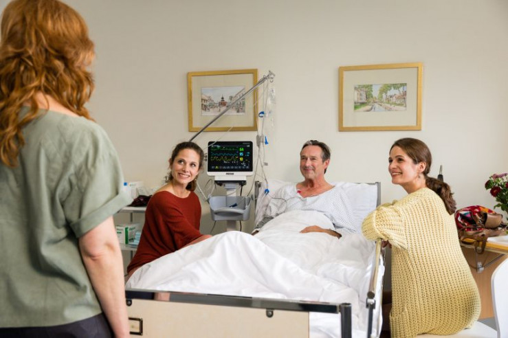 Anna (Ellenie Salvo Gonzalez, 2.v.l.) und ihre Schwester Katharina (Anna Puck, r.) spüren, dass sich zwischen ihrem Vater Carl (Helmut Zierl, 2.v.r.) und seiner chaotischen Nachbarin Lotta (Fanny Stavjanik, l.) etwas anbahnt.