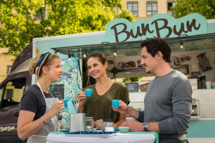 Anna (Ellenie Salvo Gonzalez, M.) führt mit Sophie (Merle Collet, l.) etwas im Schilde. Ihr Chef Sven (Markus Brandl) ist ahnungslos.