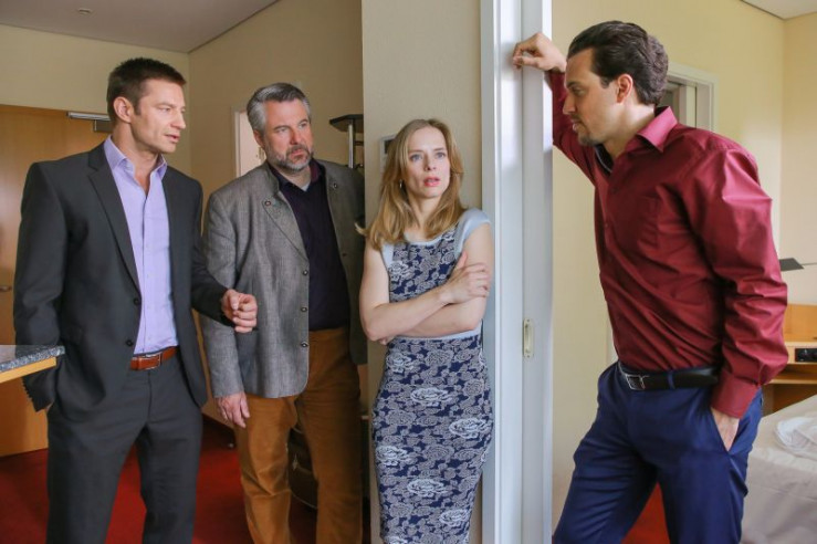 Marie (Karin Thaler, l.) präsentiert Kommissar Stadler (Dieter Fischer, r.) stolz den ersten Fund von Dr. Schober (Ralf Komorr, M.).