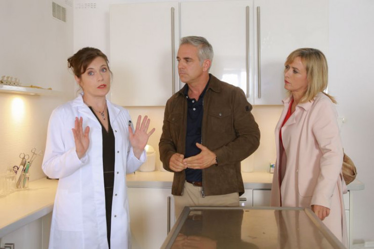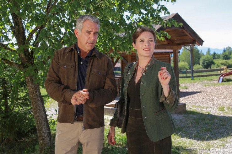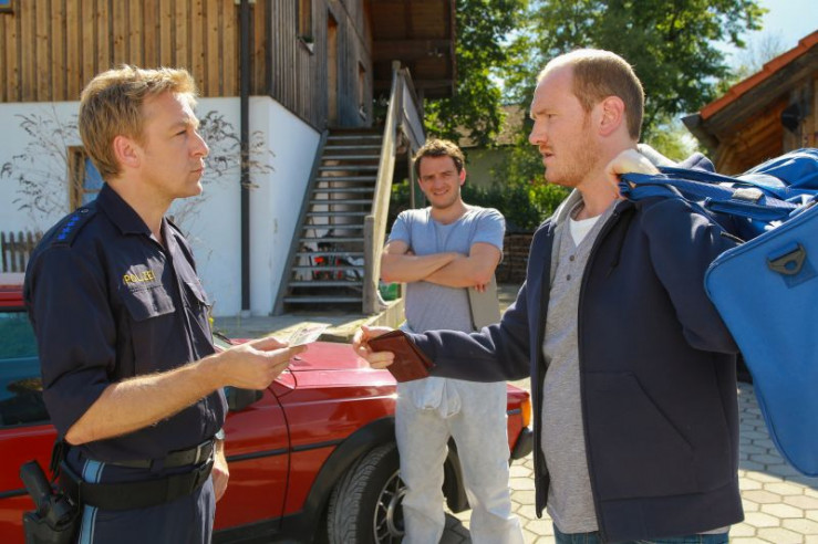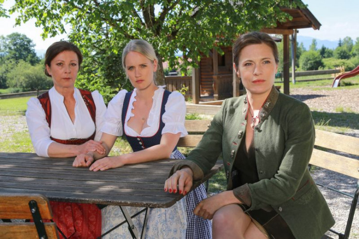 Die Kommissare Bergmann (Florian Fitz, M.) und Danner (Katharina Abt, r.) konfrontieren Sonja Amann (Claudia Hinterecker, l.) damit, dass ihr Dirndltuch möglicherweise die Tatwaffe sein könnte. (Im Hintergrund: Komparsen).
