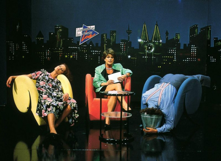 "Schreinemakers ihre Schwester Live" mit Esther Schweins (l.), Tanja Schumann als Margarethe Schreinemakers und Tommy Krappweis (r.).