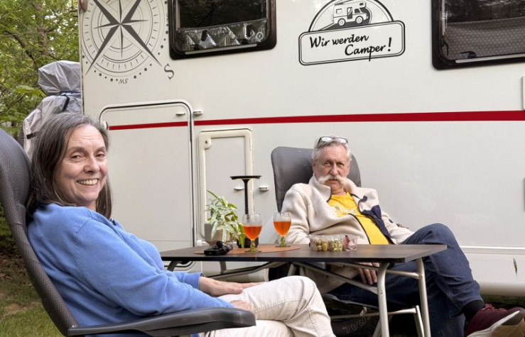 Petra (l) und Rüdiger Erbslöh vor ihrem Camper, den sie liebevoll "Olaf" genannt haben.