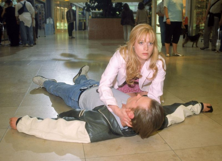 Clarissa (Sophie Adell) beugt sich über den von Schüssen getroffenen Norbert (Thomas Wingrich), der versucht hat, den flüchtenden Bankräuber aufzuhalten...
