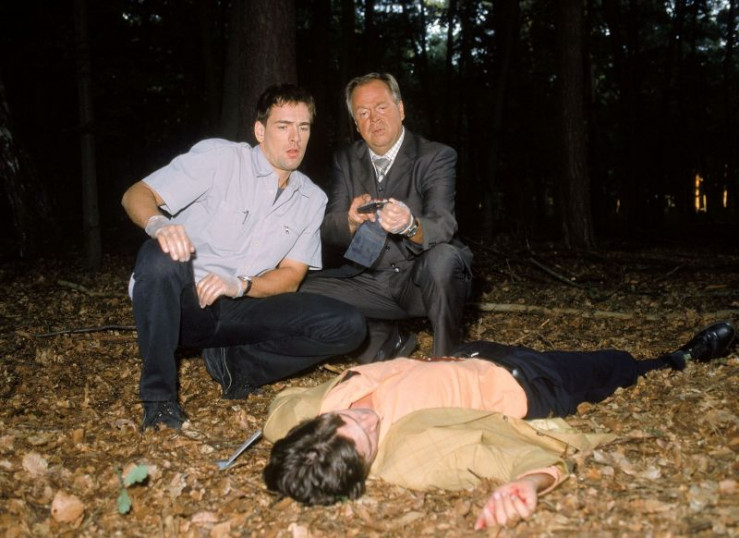Die Kommissare Bonhoff und Kehler (li. Wolfgang Krewe, re. Wolfgang Bathke) untersuchen die Leiche und finden ein Handy, das ihnen möglicherweise einen Hinweis auf den Täter gibt.