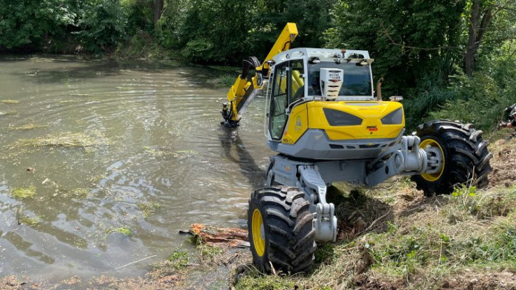 Dank des unterschiedlich bestückbaren Teleskop-Arbeitsarms kann der Bagger unter anderem Bohren, Mulche einsetzen und Bäume fällen.