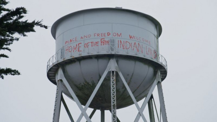 Der Wasserturm von Alcatraz trägt noch immer die Schriftzüge aus den 1970er Jahren, als die "Indianer aller Stämme" die ehemalige Gefängnisinsel besetzten.