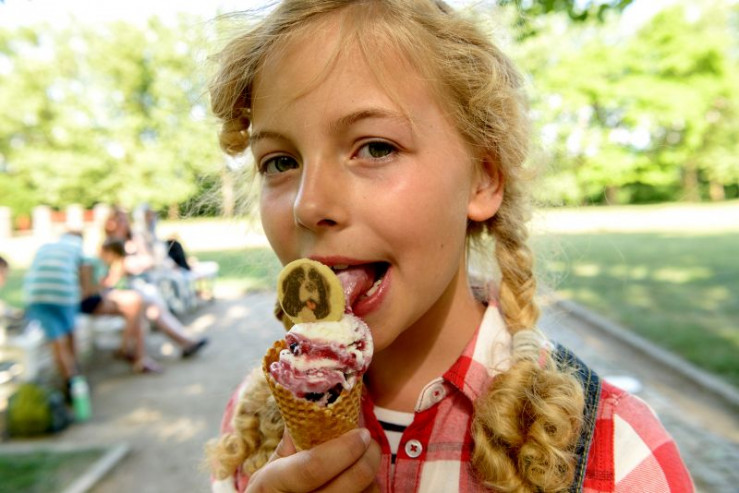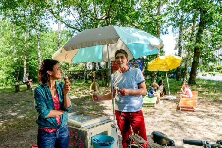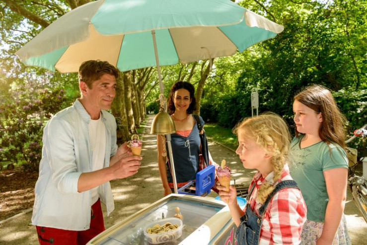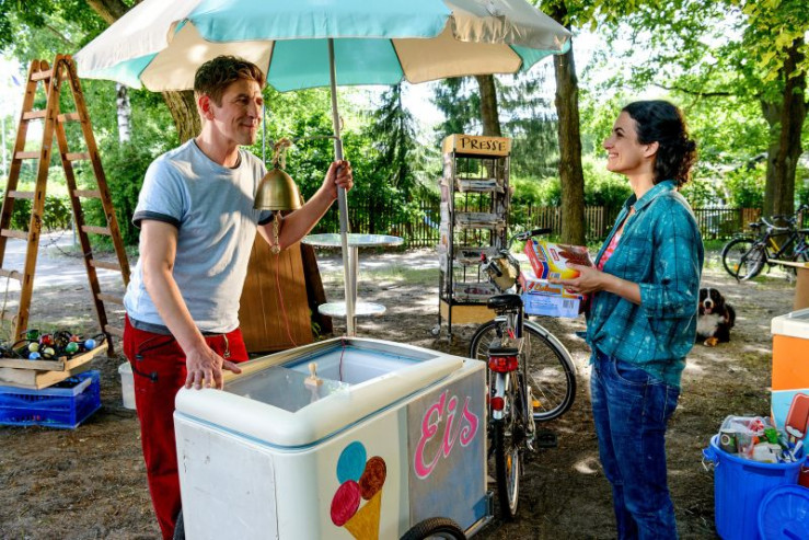 Fritz' (Guido Hammesfahr, links) neueste Eiskreationen sind der Renner in Bärstadt. Yasemin (Sanam Afrashteh, 2.von links) hat nicht mit so einer Unterstützung für ihren Kiosk gerechnet. Der jungen Kundschaft schmeckt's (Jolina Amely Trinks, 2.von rechts) (Mirjam Holl, rechts).