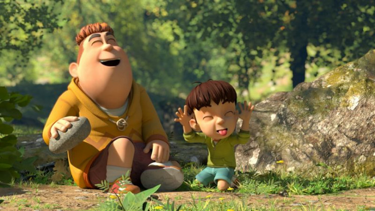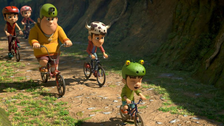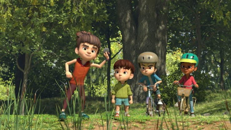 Bohnenstange und ihr Bruder Kleiner Fuß spielen am Weiher und lernen dort Raphael und Lina kennen, die mit dem Rad unterwegs sind. © ZDF/La Station Animation - Honorarfreie Verwendung gemäß AGB im redaktionellen Zusammenhang mit genannter Sendung bei Nennung "Bild: ZDF/La Station Animation" einschließlich Social Media Einschließlich Social Media© ZDF/La Station Animation - Honorarfreie Verwendung gemäß AGB im redaktionellen Zusammenhang mit genannter Sendung bei Nennung "Bild: ZDF/La Station Animation" einschließlich Social Media Einschließlich Social Media