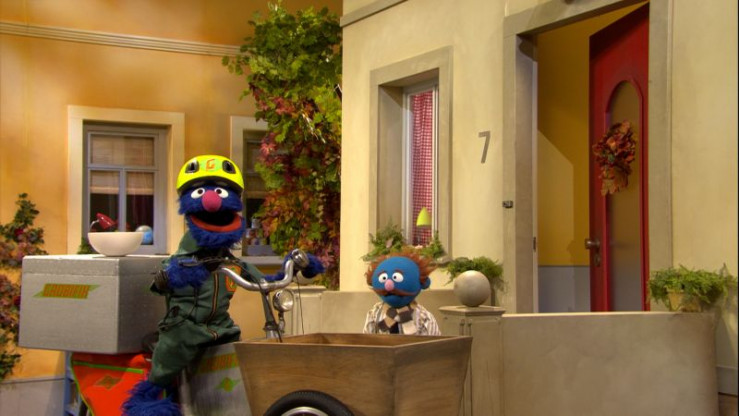 Ferner ringt Grobi als Essenslieferant mit dem Unterschied zwischen "drinnen", "darunter" und "darauf".