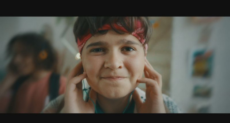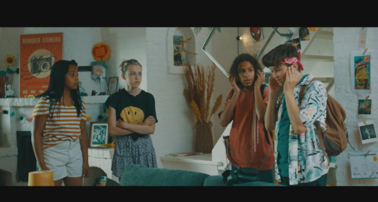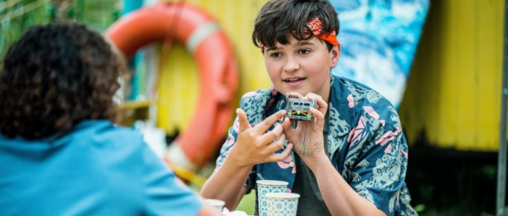 Felix (Junes Callaert) und Sammy (Arthur Hermans) hören mit dem Walkman, Ella (Cécile Enthoven) und Noor (Maja Azila) schauen gespannt zu.