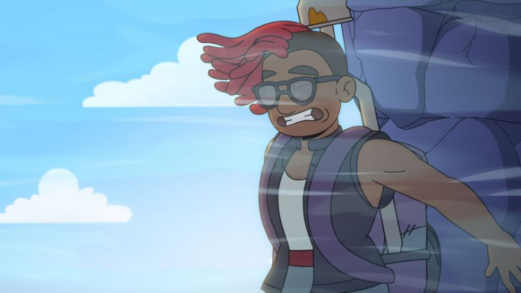 Brunhild wird beim Passieren des Gebirgspfades von einer starken Windböe erfasst.