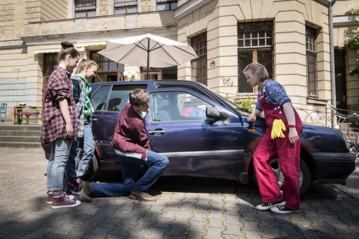 Die vier Missetäter versuchen den Schaden an Frau Schillers Karre zu beheben.