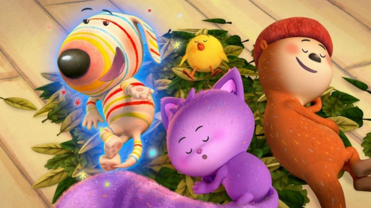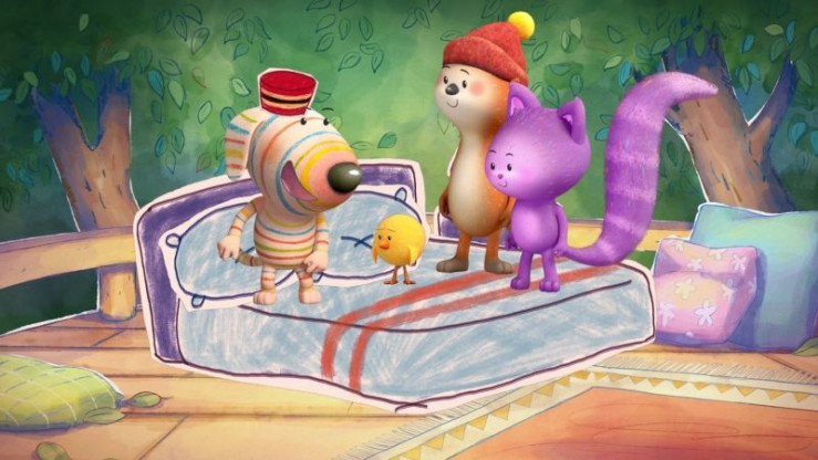 Hotelmanager Dylan (links) und seine Angestellten Ozzy und Daisy (rechts) möchten ihrem Gast, dem Küken Bitsy, den Aufenthalt im Hotel so angenehm wie möglich machen. Stolz präsentieren sie Bitsy ihr komfortables Zimmer.