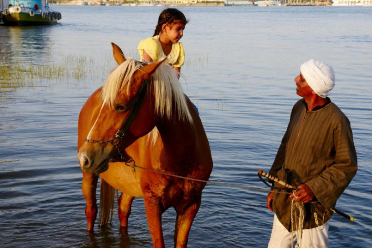 Pferdetrainer Gaber Ahmed Abdel Galiel mit Pferd 'Gold' und Schülerin: Pferdetrainer Gaber übt mit seiner Schülerin im flachen Nilwasser, weil sie Angst vorm Herunterfallen hat.