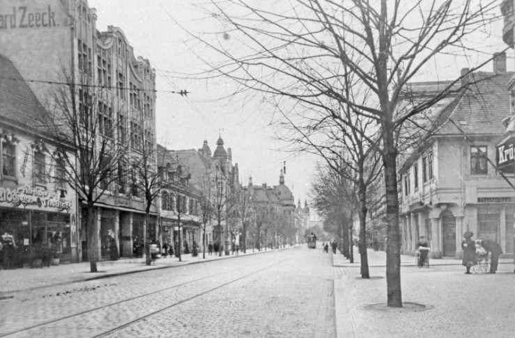 Die Dessauer Kavaliertstraße mit dem Kaufhaus Zeeck (li) im Jahr 1921