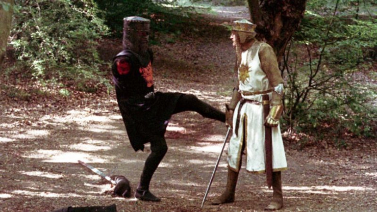 König Artus (Graham Chapman, re.) im Kampf mit dem Schwarzen Ritter (John Cleese)