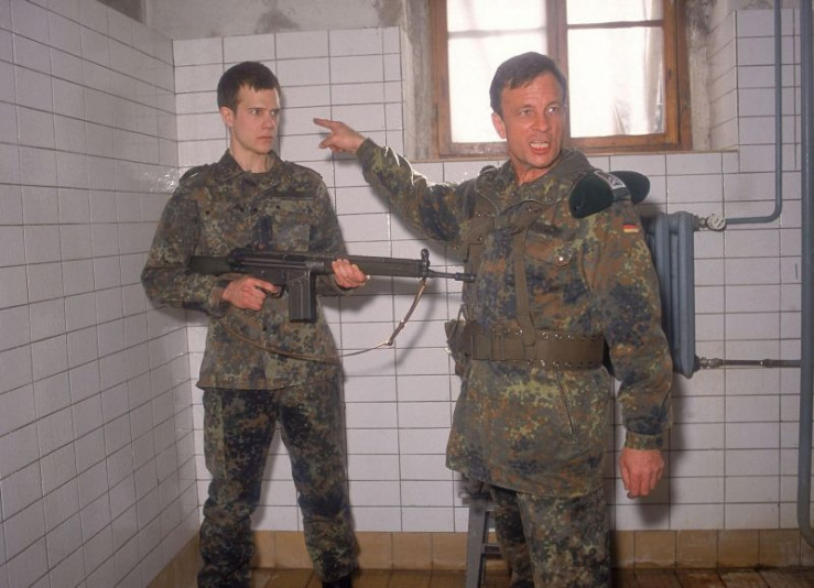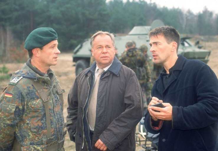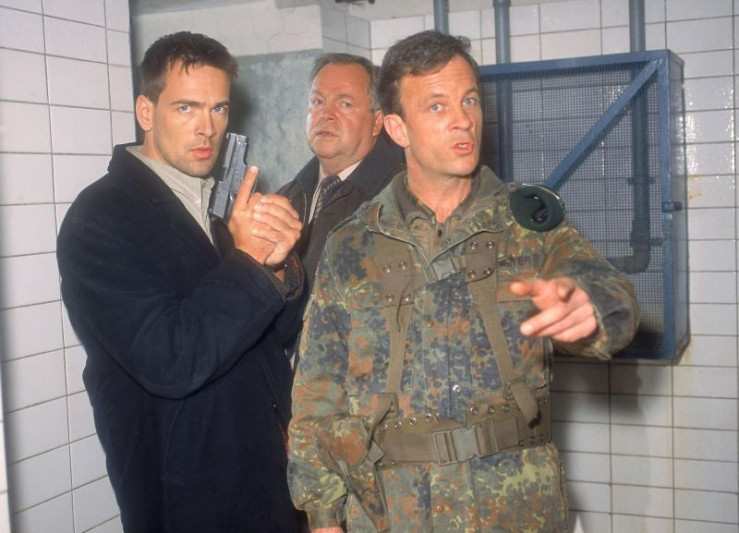 Der Soldat Heinz ist durchgedreht und bedroht die Kommissare (li. Wolfgang Krewe, Mi. Wolfgang Bathke) mit seinem Schnellfeuergewehr. Oberfeldwebel Walter (Thomas Anzenhofer) versucht die heikle Situation zu beenden...