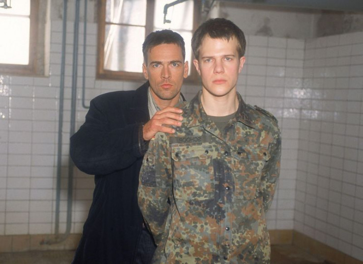 Kommissar Bonhoff (Wolfgang Krewe, li.) nimmt den Soldaten Heinz Schoop (Jens Waggon) fest.
