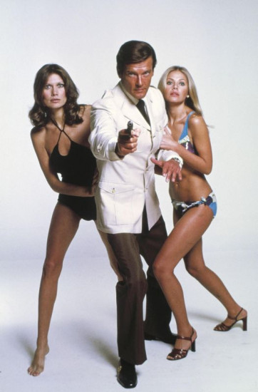 Andrea (Maud Adams, l.), James Bond (Roger Moore), Mary Goodnight (Britt Ekland)