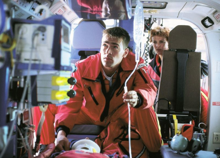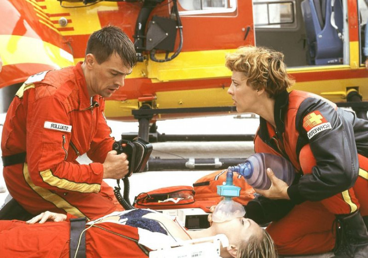 Sanitäter Staller (Wolfgang Krewe) kümmert sich im Medicopter um die Weiterversorgung seiner verunglückten Kollegin (Anja Freese als Dr. Kollmann). +++ Die Verwendung des sendungsbezogenen Materials ist nur mit dem Hinweis und Verlinkung auf RTL+ gestattet. +++