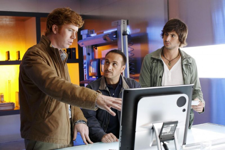 Hartmut (Niels Kurvin, l.), der Techniker der Autobahnpolizei, präsentiert Semir (Erdogan Atalay, M.) und Ben (Tom Beck) die Namen und Bilder der Bergmann Brüder.